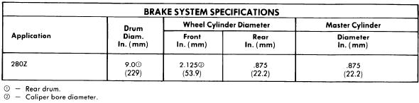 Brake system is hydraulically operated, using a tandem master cylinder and a Master-Vac power brake unit. Front brakes are Girling-Sumitomo dual piston fixed caliper type. Rear brakes are leading-trailing, shoe/drum type. Brake system is equipped with a combination valve to prevent premature locking of rear wheels. A brake warning light works off the combination valve and indicates when a pressure drop occurs in either front or rear circuit. Parking brake is mechanically actuated through cables and levers. Parking brake locks rear drum.